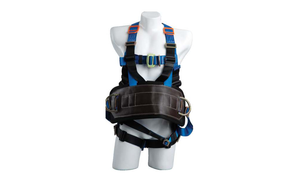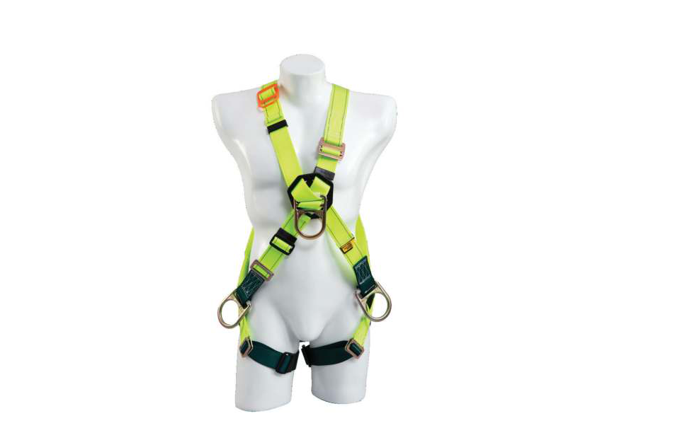 Estilo en H Argolla dorsal y frontal Extensión con argolla en D para sistema de detención de caídas Soporte lumbar con argolla para restricción de caídas Protector abdominal desmontable con argollas para encuellar Hebillas de traslape en piernas y pecho Porta-eslinga