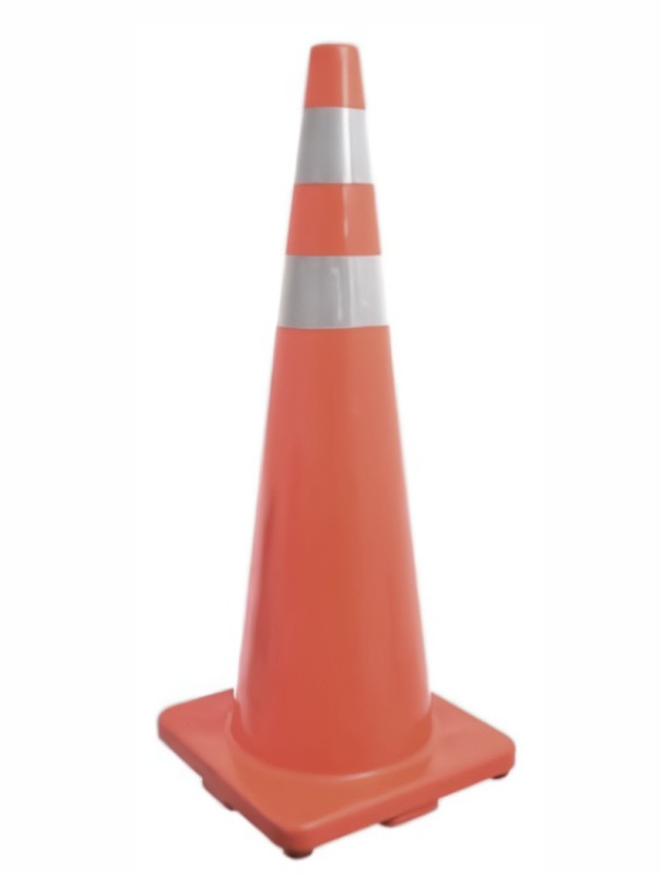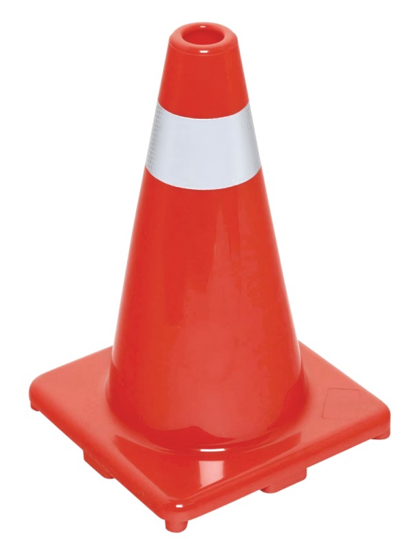 Cono de tráfico en PVC, altura 70 cm, con dos franjas reflectivas, base cuadrada. Producto importado.
