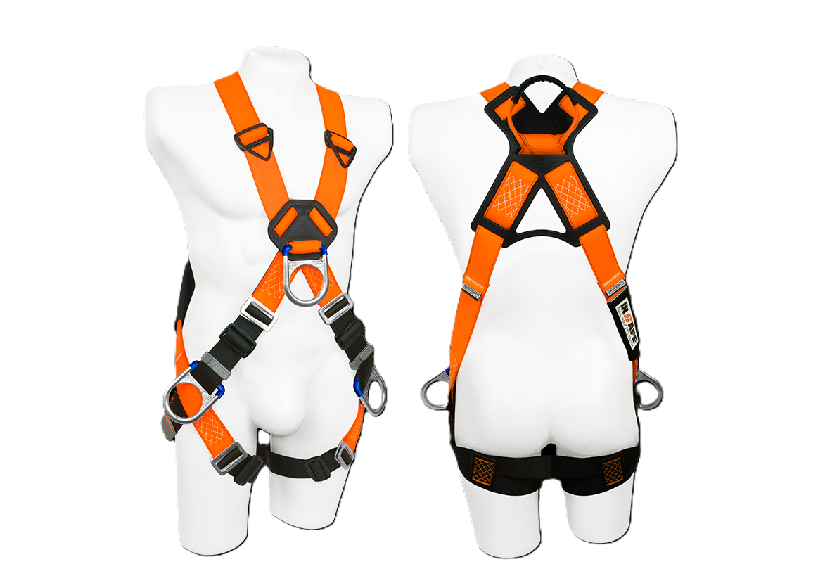 Arnés en X de cuerpo entero en reata polyester REFLECTIVA DE ALTA VISIBILIDAD. 4 ARGOLLAS EN ACERO posee 1 argolla dorsal en “D” para la detención y restricción de caídas, 2 argollas laterales en “D” para posicionamiento a un punto fijo, 1 argolla frontal en “D” para ascenso y descenso controlado. REATA REFLECTIVA 400 LÚMENES