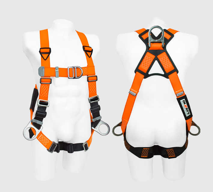 Arnés en H de cuerpo entero en reata polyester. 4 ARGOLLAS EN ALUMINIO posee 1 argolla dorsal en “D” para detención y restricción de caídas, 2 argollas laterales en “D” para posicionamiento a un punto fijo, 1 argolla frontal en “D” para ascenso y descenso controlado, SOPORTE LUMBAR CON DISEÑO ERGONÓMICO que minimiza el riesgo en las malas posturas del usuario. HERRAJE EN ALUMINIO (PESO LIGERO)