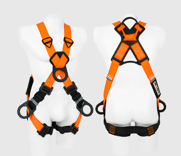 Arnés en X de cuerpo entero en reata polyester. 4 ARGOLLAS DIELÉCTRICAS posee 1 argolla dorsal en “D” para la detención y restricción de caídas, 2 argollas laterales en “D” para posicionamiento a un punto fijo y 1 argolla frontal en “D” para ascenso y descenso controlado. SOPORTE LUMBAR CON DISEÑO ERGONÓMICO Y PORTA HERRAMIENTAS PARA MANTENER LAS MANOS LIBRES. HERRAJE DIELÉCTRICO