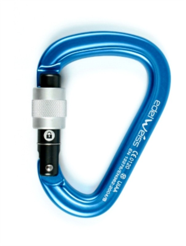 Mosquetón de aluminio asimétrico con cierre triple seguro. Certificación UIAA, CE EN 12275. Marca EDELWEISS