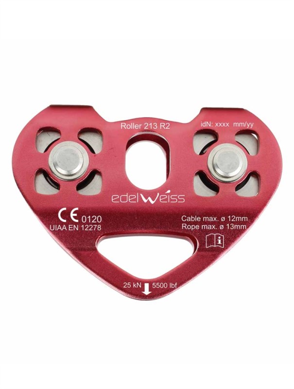 Polea doble con placas laterales móviles, resistencia 30 KN, diseñada para cargas livianas o pesadas, acepta cuerdas hasta 16 mm. Certificación CE EN 12278, UIAA. Marca EDELWEISS
