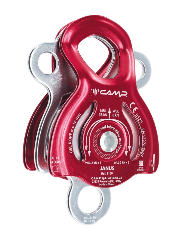 Polea doble multifunción de alta resistencia con roldanas en aluminio, para cuerdas hasta 16 mm, carga de trabajo máxima 8 kN. Certificación CE EN 12278. Marca CAMP