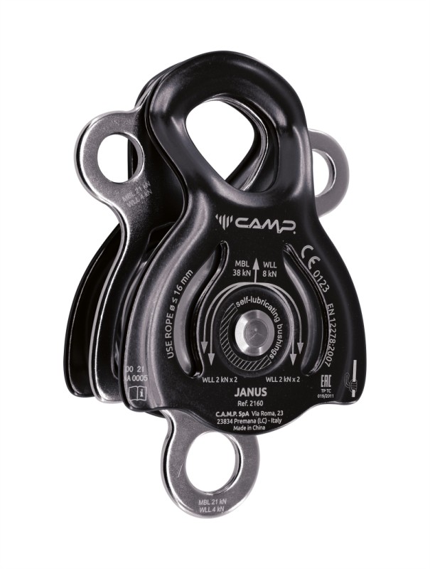 Polea doble con dos roldanas de gran diámetro, ideal para polipastos y maniobras complejas, concebida para cargas muy elevadas, rotación sobre cojinetes de bolas, rendimiento 97%, para cuerdas hasta 16 mm. Certificación CE EN 12278. Marca CAMP