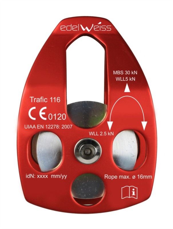 Polea sencilla de alto rendimiento con rodamientos, resistencia 30 KN, liviana y robusta, para cuerdas hasta 16 mm de diámetro. Certificación CE EN 12278, UIAA. Marca EDELWEISS
