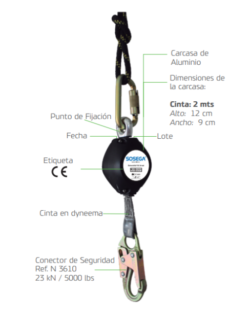 Retráctil de seguridad. Longitud del cable 10 mts. El cable se extiende y se retrae automáticamente ante fuertes movimientos del usuario. La fuerza máxima en caso de caída es de <6 kN (carga interna sistema de absorción de impactos). El retráctil de seguridad es certificado para uso vertical (norma EN 360) y aplicaciones horizontales.